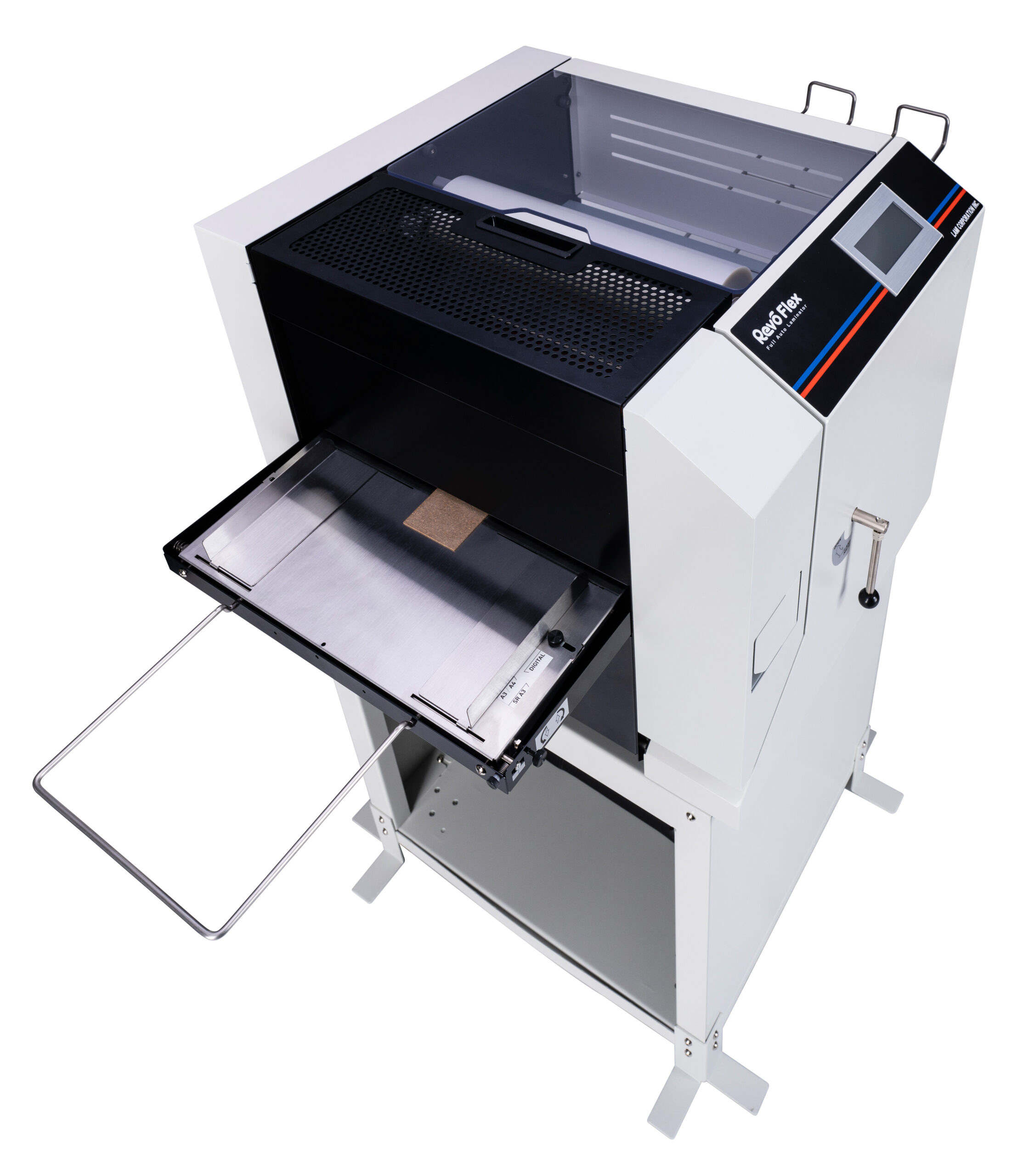 The Revo Any is a new compact and economic fully automatic laminating system. The Revo Any makes laminating work even easier with automatic feeding and simple operation for all tasks. Set the paper, press start, and let it laminate. The Revo Any is easy to setup with film reloading from the wide-open top cover.